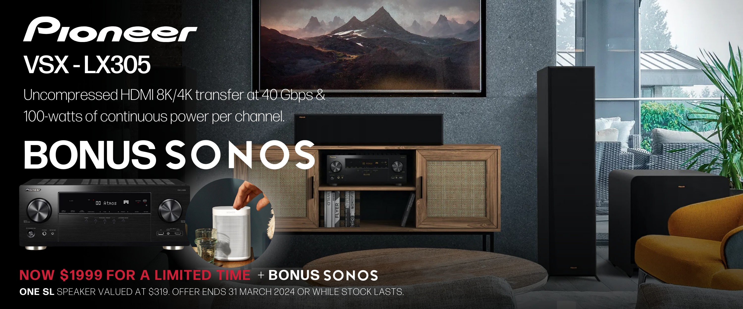 For a limited time only, purchase a Pioneer VSX-LX305 AV Receiver and receive a free Sonos One SL speaker valued at $319 RRP.